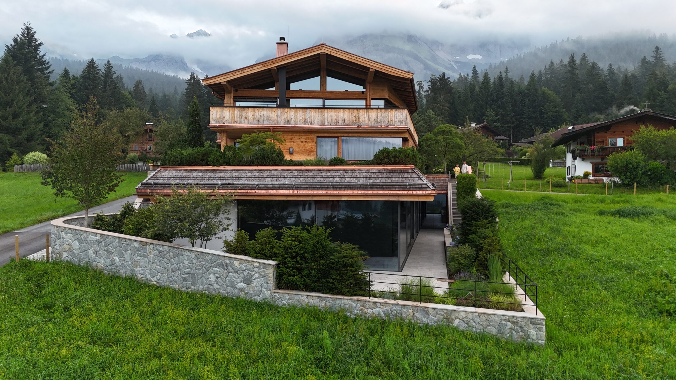 Das Chalet setzt auf eine ausgewogene Balance: die behagliche Ausstrahlung von Holz und Naturstein wird durch weite Glasflächen und den Komfort modernster Technik ergänzt. Besonders beeindruckend ist der Poolbereich im Untergeschoss: