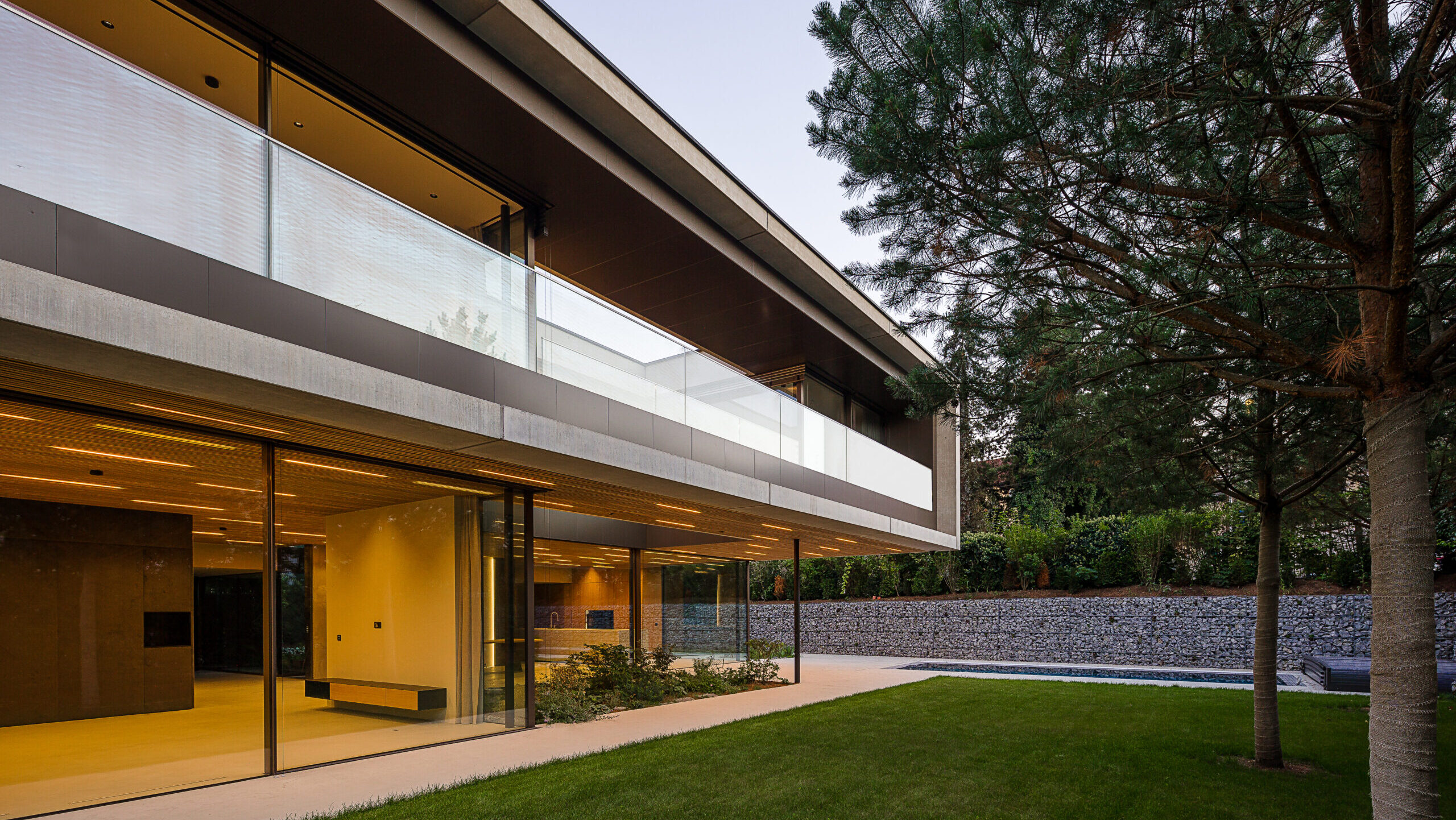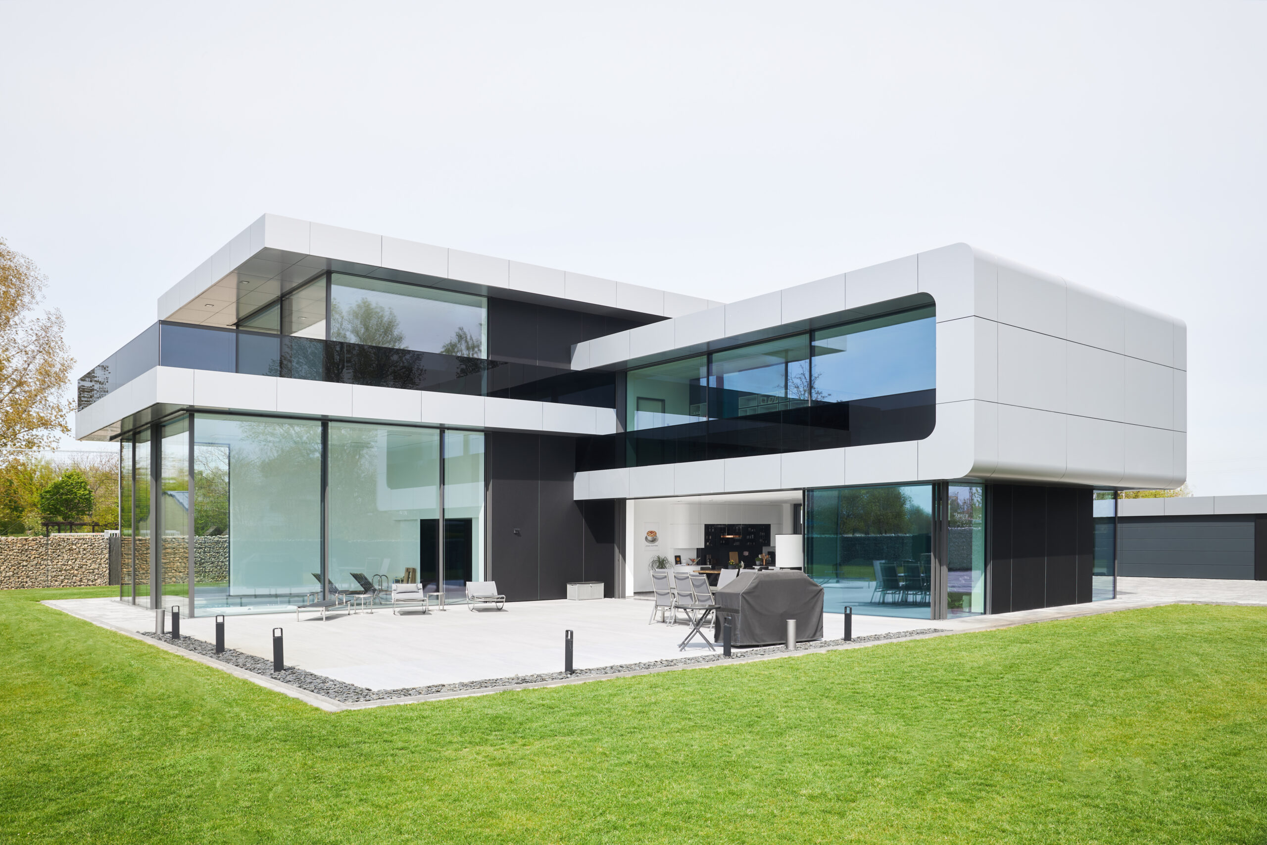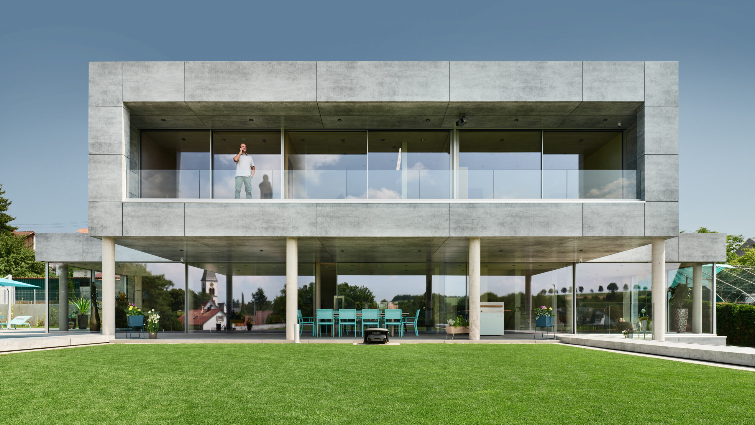 Die puristische Architektur glänzt mit Helligkeit, Offenheit und Eleganz. Das reine Design und die klaren Formen geben dem Gebäude seinen starken Ausdruck. Durch die bodentiefen und raumhohen Verglasungen von swissFineLine wird dem Erdgeschoss eine gewisse Leichtigkeit verliehen, während das betonverkleidete Obergeschoss eher massiv wirkt. Von der Ferne betrachtet scheint das Haus in der Luft zu schweben.
